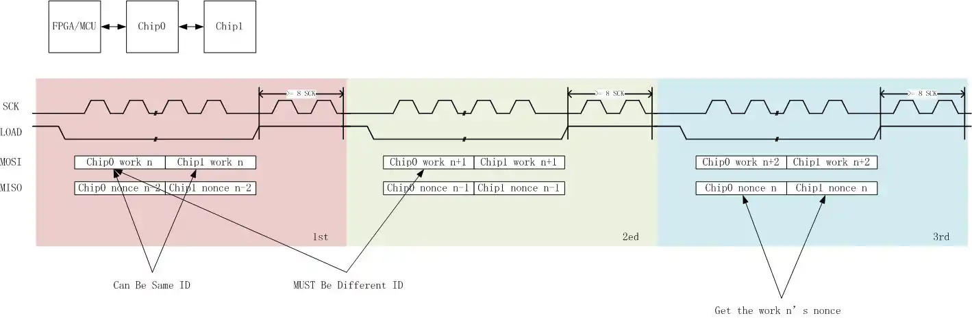 a real data: 1st: work n chip1 {576'hc16801619d8d4242e06e5fab25a54bbe222e8b877848c34beea79cd6528caf7e33cde02a983dab158119ce2a1c9fc4eddac8ce296d0fd9da6e18f645087e051a2d547050e8dc86b1, 64'ha, 32'h1, 32'h1, 32'h1} work n chip0 {576'h1bed3ba0a2cb45c1d8f8ef6712146495c44192c07145fd6d974bf4bb8f41371d65c90d1e9cb18a17fa77fe7d13cdfd7b0063910762a5f25c06b168ae087e051a895170504ac1d001, 64'h5, 32'h1, 32'h1, 32'h1} 2nd: work n+1 chip1 {576'h0, 64'hb, 32'h1, 32'h1, 32'h1} work n+1 chip0 {576'h0, 64'h6, 32'h1, 32'h1, 32'h1} 3rd: work n+2 chip1 {576'h0, 64'hc, 32'h1, 32'h1, 32'h1} work n+2 chip0 {576'h0, 64'h7, 32'h1, 32'h1, 32'h1} then get nonce 32'h1beebba0 for chip0, 32'hc1698161 for chip1;