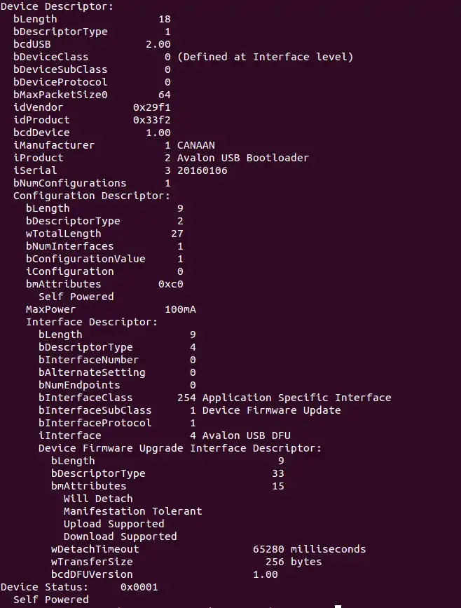 2 | bmAttributes | 1 | Bit mask | DFU attributes Bit 7……4: reserved Bit 3: device will perform a bus detach-attach sequence when it receives a DFU_DETACH request. The host must not issue a USB Reset. (bitWillDetach) 0 = no 1 = yes Bit 2: device is able to communicate via USB afeter Manifestation phase.(bitManifestationTolerant) 0 = no, must see bus reset 1 = yes Bit1: upload capable(bitCanUpload) 0 = no 1 = yes Bit0: download capable(bitCanDnload) 0 = no 1 = yes |