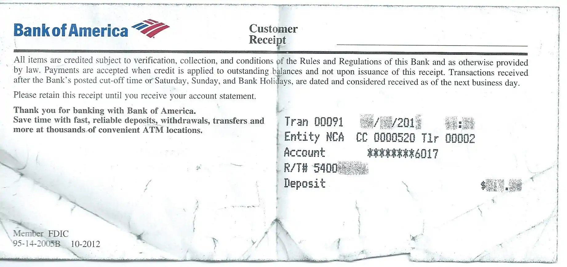 Bank of America customer receipt for LocalTill cash deposit