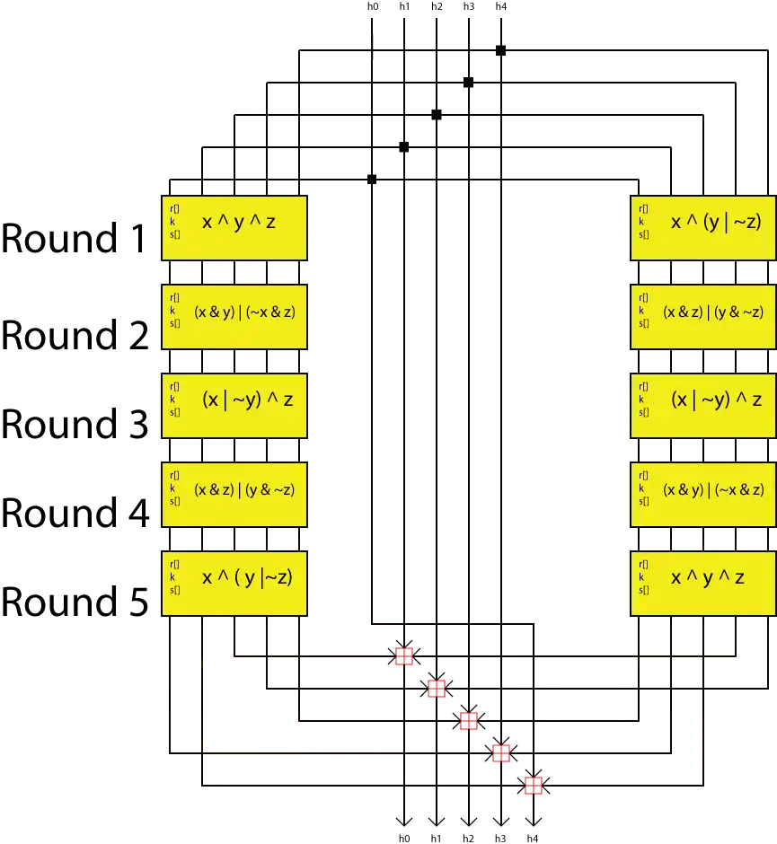 RIPEMD-160 is a cryptographic hash function based upon the Merkle–Damgård construction. It is used in the Bitcoin standard. It is a a strengthened version of the RIPEMD algorithm which produces a 128 bit hash digest while the RIPEMD-160 algorithm produces a 160-bit output. The compression function is made up of 80 stages made up of 5 blocks that run 16 times each. This pattern runs twice with the results being combined at the bottom using modulo 32 addition.