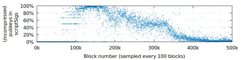 The original Bitcoin software released in 2009 used 65-byte uncompressed public keys to identify the owner of a set of bitcoins. In 2012, Bitcoin protocol developer Pieter Wuille implemented a change to the program now known as Bitcoin Core that allowed it to use 33-byte compressed public keys instead.[1] As Bitcoin Core users adopted this feature and other wallets upgraded to use it as well, this reduced the size of a typical transaction on the network (with one input and two outputs) from about 258 bytes to about 226 bytes, a 14% savings.
