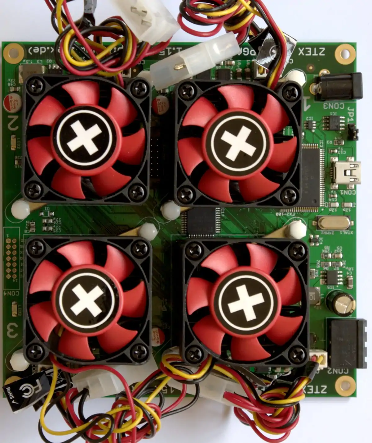 These FPGA Board have on-board voltage regulators and an USB controller which is used for communication and device programming. Low cost FPGA mining rigs can be build using standard components (USB hubs, USB cables, ATX PSU's).