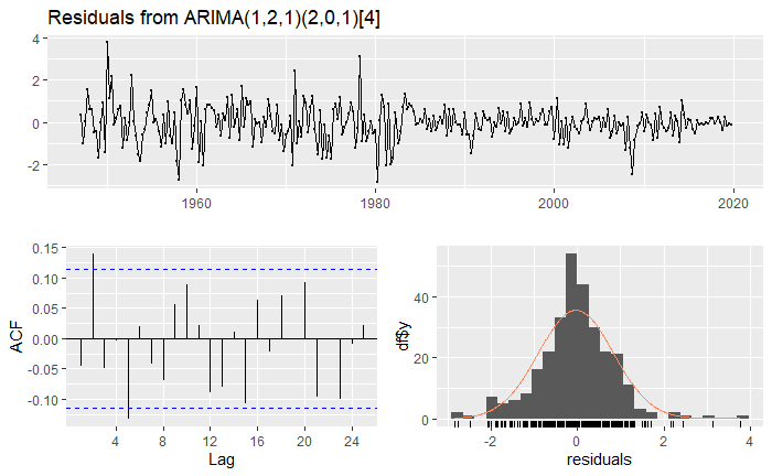 #A seasonal model was selected, with non-seasonal components (p,d,q)=(1,2,1), and seasonal components (P,D,Q)=(2,0,1)