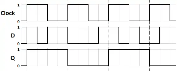 A change is triggered when the clock is at a positive (leading) edge, the state of the control input is stored for the clock cycle. An example can be seen below.