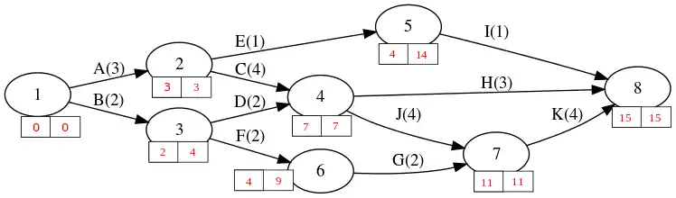 - Total float: This is greatest amount of time we can wait before starting the activity and getting it finished before the next activity must start. Node 6 indicates the latest time the node can be left is 9, so our activity must be finished by then. Node 3 indicates we could start the activity as early as 2, the duration of the activity is 2, so in the space of (9-2)=7 units of time, the activity must be done, which takes 2 units of time, leaving 5 units of time, this is the total float