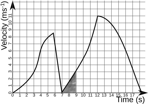 A velocity-time graph plots the velocity of an object, relative to a certain point, with time on the x-axis and velocity on the y-axis. We already know that velocity is the gradient (derivative) of the distance function. Since integration is the inverse process to differentiation, if we have a velocity-time graph and wish to know the distance travelled between two points in time, we can find the area under the graph between those two points in time. In general: