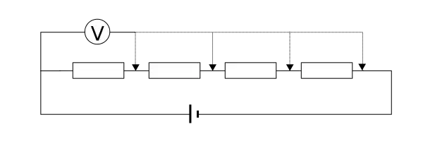 Alternatively, a potential divider may be made of many resistors. A 'wiper' may move across them, varying the number of resistors on either side of the wiper as it moves, as in the following diagram: