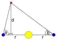 Let r be the radius of the Earth's orbit (assumed to be constant for simplicity's sake), a and b be the angles to the star (from the horizontal) when the Earth is on either side of the Sun, and let d be the perpendicular distance from the plane of the Earth's orbit to the star, as shown in the diagram on the right. By simple trigonometry: