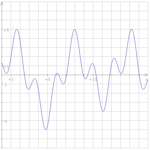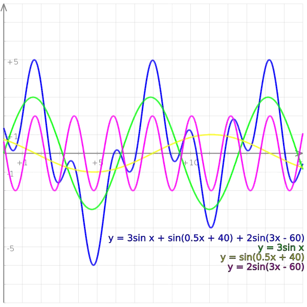This signal is constructed from a number of different sine waves, with different frequencies, added together. These sine waves are as follows: