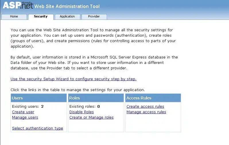 <configuration> <connectionStrings> <add name="SqlServices" connectionString="Data Source=localhost;Initial Catalog=aspnetdb;Integrated Security=SSPI;" /> </connectionStrings> <system.web> <authentication mode="Forms" > <forms loginUrl="login.aspx" name=".ASPXFORMSAUTH" /> </authentication> <authorization> <deny users="?" /> <allow roles="Administrators" /> <deny users="*" /> </authorization> <membership defaultProvider="AspNetSqlProvider" userIsOnlineTimeWindow="15"> </membership> <roleManager defaultProvider="SqlProvider" enabled="true" cacheRolesInCookie="true" cookieName=".ASPROLES" cookieTimeout="30" cookiePath="/" cookieRequireSSL="true" cookieSlidingExpiration="true" cookieProtection="All" > <providers> <clear /> <add name="SqlProvider" type="System.Web.Security.SqlRoleProvider" connectionStringName="SqlServices" applicationName="SampleApplication" /> </providers> </roleManager> </system.web> </configuration>