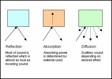 Have you ever listened to speakers outside? You might have noticed that the sound is thin and dull. This occurs because when sound is reflected, it is fuller and louder than it would if it were in an open space. So when sound is reflected, it can add a fullness, or spaciousness. The bad part of reflected sound occurs when the reflections amplify some notes, while cancelling out others, making the sound distorted. It can also affect tonal quality and create an echo-like effect. There are three types of reflected sound, pure reflection, absorption, and diffusion. Each reflection type is important in creating a "theater" type acoustic room.