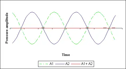 Let's consider the noise a person would hear when a car drives past. This sound would physically correspond to the pressure variation of the air which would make his ear-drum vibrate. The curve A1 of the graph 1 could represent this sound. The pressure amplitude is a function of the time at a certain fixed place. If another sound wave A2 is produced at the same time, the pressure of the two waves will add. If the amplitude of A1 is exactly the opposite of the amplitude A2, then the sum will be zero, which corresponds physically to the atmospheric pressure. The listener would thus hear nothing although there are two radiating sound sources. A2 is called the destructive interference.