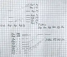 and then, by using the projection operation method, we can find the irreducible representations of the ligand's sigma and pi orbital. In this case, the sigma orbital has A1g, B1g, Eu three irreducible representations and the pi orbital has A2g, A2u, B2g, B2u, Eg and Eu.