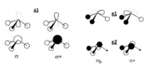 The reduced reducible representation (methodology and concepts further elaborated in Representations section of Advanced Inorganic Chemistry) of the sigma bonds is then written into linear combinations of irreducible representations of ΓSH= a1 + e, as shown in the table. The irreducible representations are determined by the equation ni = 1/h Σ NXRXI where ni is the coefficient of the ith reducible representation, XR and XI are characters of reducible and irreducible representations respectively, N is the coefficient in front of each symmetry elements found on the top row of the character table, and h is the order of the group and sum of the coefficients of the symmetry element symbols.