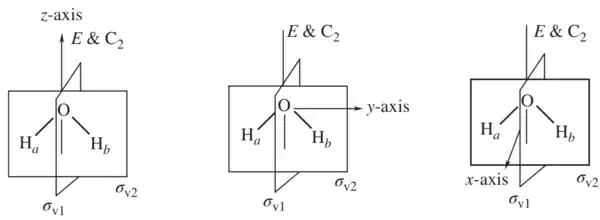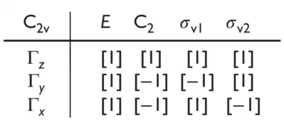 To apply a symmetry operation on an atom of a molecule, matrices can be combined to produce another operation in the group. For a C2v symmetry compound such as water shown in figure 2, the operations (E, C2, σv1, σv2) can be applied on the vector (x, y, z) to find the representation. To simplify the math, a 1x1 matrix can be done by block diagonalizing for individual vector.