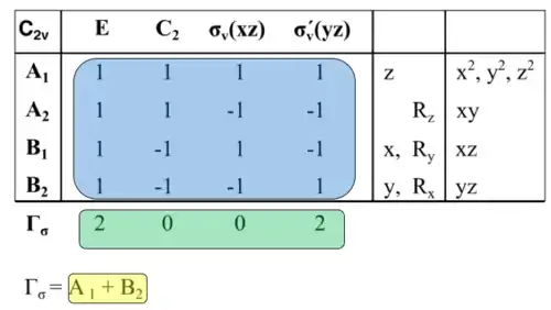 The green shaded part in figure 5 is a the reducible representation that is found based on number of unmoved molecule after a symmetry operation. For example, if we are looking at Γσ of C2v symmetry molecule such as water from figure 5, we would focus on the number of unmoved σ bonds after the symmetry operation. In a water molecule, there are two s bonds which are the two O-H bonds. If we apply E, both of the bonds don’t move, so the reducible representation would be 2 because each unmoved σ bonds contribute to 1 reducible representation. If we apply C2 operation on it, both bonds would move, where the O-H bonds would switch places. This means that there are zero unmoved σ bonds, so the reducible representation would be zero as shown in figure 5 b.
