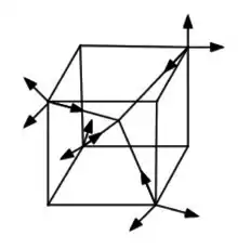 The first step to constructing the molecular orbitals (MOs) is to determine the reducible representations for the σ and π bond vectors, denoted and , respectively. The character corresponding to each symmetry operation can be determined by tracking how the bond vectors transform. Each vector that is left unmoved will contribute +1, each vector that is shifted to a new position will contribute 0, and each vector that undergoes a sign reversal will contribute −1. The reducible representations and are listed below: