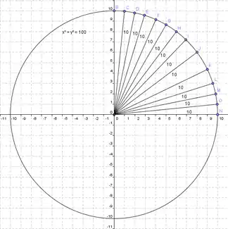 A circle is defined as the set of points that are a fixed distance from a center point. This definition is expressed in the way we draw circles. We pick a point as the center and then use some mechanical means to rotate a drawing utensil around that point. Of course our drawings are always approximations of the shape we think of as a circle. Drawings are only as accurate as the hardness and thickness of our tools will allow. For instance if you blow the drawing below up large enough on your computer screen you might see it is composed of adjacent colored squares and rectangles on your screen. If you used software that maintained the scale of the points as you magnified the circle then eventually it would start to look like a line. This is the reason that we perceive roads as being straight even though we know the Earth is round.