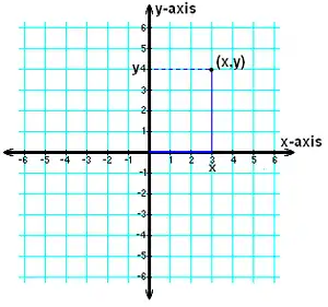 The axes and plane field extend out as close to infinity (positive and negative) as is necessary for any analysis. In practice graphs are abbreviated to areas of examination. In our example the generic point x,y is assigned to number values (x = 3, y =4) by plotting it at point 3,4. A line and a dotted line show that this position is located by starting at (0,0), moving 3 units in the positive x direction (right), and moving 4 units in the positive y direction (upwards).
