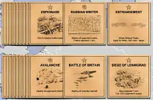 Players lands on Strategic Place to draw a strategic card. Some strategic cards might be kept for later use. Some strategic cards such as Battle of Britain, Pearl Harbor affect on countries/territories, some strategic cards affect on player such as Siege of Leningrad, some affect Secret Base & Special territories.