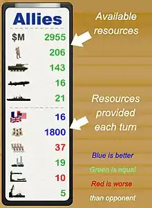 There are 5 resources in Allies v.s Axis: money, infantry, tank, aircraft & battleship.