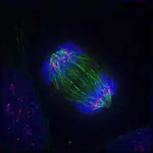 Metaphase, from the ancient Greek meta (between) and phase (stage), is a stage of mitosis in the eukaryotic cell cycle in which condensed & highly coiled chromosomes, carrying genetic information, align in the middle of the cell before being separated into each of the two daughter cells. Metaphase accounts for approximately 4% of the cell cycle's duration. Preceded by events in prometaphase and followed by anaphase, microtubules formed in prophase have already found and attached themselves to kinetochores in metaphase. The centromeres of the chromosomes convene themselves on the metaphase plate (or equatorial plate), an imaginary line that is equidistant from the two centrosome poles. This even alignment is due to the counterbalance of the pulling powers generated by the opposing kinetochores, analogous to a tug of war between equally strong people. In certain types of cells, chromosomes do not line up at the metaphase plate and instead move back and forth between the poles randomly, only roughly lining up along the middleline. Early events of metaphase can coincide with the later events of prometaphase, as chromosomes with connected kinetochores will start the events of metaphase individually before other chromosomes with unconnected kinetochores that are still lingering in the events of prometaphase. One of the cell cycle checkpoints occurs during prometaphase and metaphase. Only after all chromosomes have become aligned at the metaphase plate, when every kinetochore is properly attached to a bundle of microtubules, does the cell enter anaphase. It is thought that unattached or improperly attached kinetochores generate a signal to prevent premature progression to anaphase, even if most of the kinetochores have been attached and most of the chromosomes have been aligned. Such a signal creates the mitotic spindle checkpoint. This would be accomplished by regulation of the anaphase-promoting complex, securin, and separase.[6]