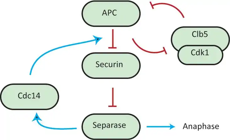 It has been shown by Holt et al.[21] that separase activates Cdc14, which in turn acts on securin, thus creating a positive feedback loop that increases the sharpness of the metaphase to anaphase transition and coordination of sister-chromatid separation.[21] Holt et al. probed the basis for the effect of positive feedback in securin phosphophorlyation by using mutant 'securin' strains of yeast, and testing how changes in the phosphoregulation of securin affects the synchrony of sister chromatid separation. Their results indicate that interfering with this positive securin-separase-cdc14 loop decreases sister chromatid separation synchrony. This positive feedback can hypothetically generate bistability in the transition to anaphase, causing the cell to make the irreversible decision to separate sister-chromatids.