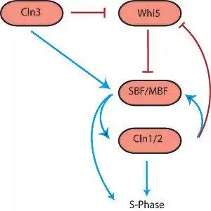 The G1/S transition, more commonly known as the Start checkpoint in budding yeast (the restriction point in other organisms) regulates cell cycle commitment At this checkpoint, cells either arrest before DNA replication (due to limiting nutrients or a pheromone signal), prolong G1 (size control), or begin replication and progress through the rest of the cell cycle. The G1/S regulatory network or regulon in budding yeast includes the G1 cyclins Cln1, Cln2 and Cln3, Cdc28 (Cdk1), the transcription factors SBF and MBF, and the transcriptional inhibitor Whi5.[11] Cln3 interacts with Cdk1 to initiate the sequence of events by phosphorylating a large number of targets, including SBF, MBF and Whi5. Phosphorylation of Whi5 causes it to translocate out of the nucleus, preventing it from inhibiting SBF and MBF. Active SBF/MBF drive the G1/S transition by turning on the B-type cyclins and initiating DNA replication, bud formation and spindle body duplication. Moreover, SBF/MBF drives expression of Cln1 and Cln2, which can also interact with Cdk1 to promote phosphorylation of its targets.