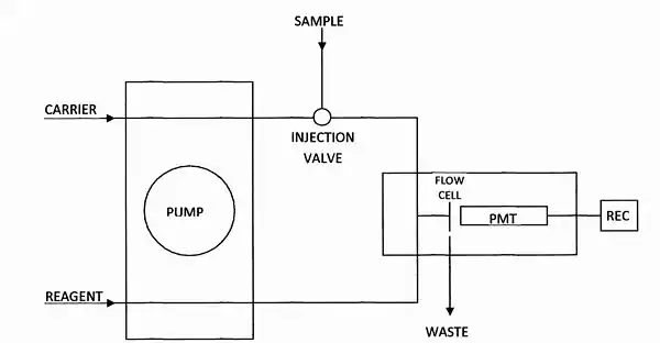 Figure D2.1 – A flow injection manifold for measuring chemiluminescence (PMT = photomultiplier tube; REC = recorder).