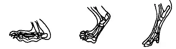 The legs of the horse are highly adapted to give it great galloping speed over long distances. The bones of the lower leg and foot are greatly elongated and the hooves are actually the tips of the third fingers and toes, the other digits having been lost or reduced (see diagram 6.9).