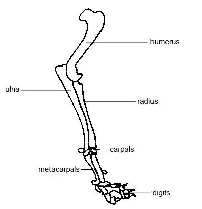 The forelimb consists of: Humerus, radius and ulna, carpals, metacarpals, digits or phalanges (see diagram 6.6). The top of the humerus moves against (articulates with) the scapula at the shoulder joint. By changing the number, size and shape of the various bones, fore limbs have evolved to fit different ways of life. They have become wings for flying in birds and bats, flippers for swimming in whales, seals and porpoises, fast and efficient limbs for running in horses and arms and hands for holding and manipulating in primates (see diagram 6.8).