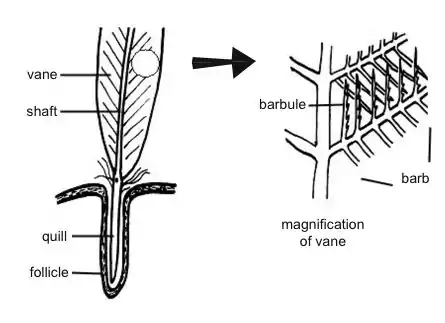 Contour feathers are large feathers that cover the body, wings, and tail. They have an expanded vane that provides the smooth, continuous surface that is required for effective flight. This surface is formed by barbs that extend out from the central shaft. If you look carefully at a feather you can see that on either side of each barb are thousands of barbules that lock together by a complex system of hooks and notches. if this arrangement becomes disrupted, the bird uses its beak to draw the barbs and barbules together again in an action known as preening (see diagram 5.7).
