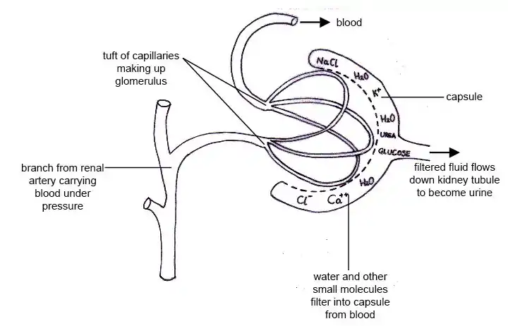 At one end of each nephron, in the cortex of the kidney, is a cup shaped structure called the (Bowman’s or renal) capsule. It surrounds a tuft of capillaries called the glomerulus that carries high-pressure blood. Together the glomerulus and capsule act as a blood-filtering device (see diagram 12.7). The holes in the filter allow most of the contents of the blood through except the red and white cells and large protein molecules. The fluid flowing from the capsule into the rest of the kidney tubule is therefore very similar to blood plasma and contains many useful substances like water, glucose, salt and amino acids. It also contains waste products like urea.
