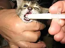 If one is taking care of a motherless kitten between birth and four weeks, one needs to take very good care of them or they will become sick. Fostering a very young kitten can be chancy; a veterinarian's advice is highly recommended. Kittens are born unable to see, hear, regulate their own body temperature, or even eliminate on their own, and require a lot of care in the first few weeks. All baby kittens need to be fed every 3–4 hours. They also need to be kept nice and warm or they will not eat. A good way to keep a baby kitten warm is to fill a soft drink bottle with the hottest water you can get, then surround that bottle with blankets and have the kitten sleep there. Baby kittens should be taken to a vet when they are between the ages of 2–3 weeks old. Kittens need to be played with but, like all babies, they can get in trouble and hurt themselves, so they need to be watched closely.