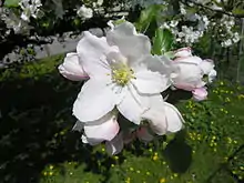 In the wild, apples grow quite readily from seeds. However, like most perennial fruits, apples are ordinarily propagated asexually by grafting. This is because seedling apples are an example of "Extreme heterozygotes", in that rather than inheriting DNA from their parents to create a new apple with those characteristics, they are instead different from their parents, sometimes radically.[1] Triploids have an additional reproductive barrier in that the 3 sets of chromosomes cannot be divided evenly during meiosis yielding unequal segregation of the chromosomes (aneuploids). Even in the very unusual case when a triploid plant can produce a seed (apples are an example), it happens infrequently, and seedlings rarely survive.[2] Most new apple cultivars originate as seedlings, which either arise by chance or are bred by deliberately crossing cultivars with promising characteristics. The words 'seedling', 'pippin', and 'kernel' in the name of an apple cultivar suggest that it originated as a seedling. Apples can also form bud sports (mutations on a single branch). Some bud sports turn out to be improved strains of the parent cultivar. Some differ sufficiently from the parent tree to be considered new cultivars.[3]