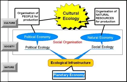 In such a pyramid, consisting of ‘nature’, ‘society’ and ‘culture, the two functional pillars of social organisation are the organisation of people for production (political economy) and the organisation of natural resources for production (natural economy). Both of these economies draw upon what may be called the planetary economy. This model of cultural ecology is provisionally set out in Fig 11.1. Geographers and anthropologists mean different (but complementary) things by "cultural ecology." In general, "cultural ecology" studies the relationship between a given society and its natural environment. But geographers generally mean the study of how socially organized human activities affect the natural environment; anthropologists generally mean the study of how the natural environment affects socially organized behaviours (although, at its extreme, environmental determinism has fallen out of favour among most anthropologists).