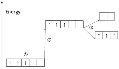 ③. Critically, the ligands will come closer to some d-orbitals than to others. Typically, two or three of the orbitals will be destabilised more than the remainder.
