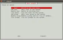 A radio list is a dialog where the user can select one option from a list. The difference between a radio list and a menu is that the user selects an option (using the space bar in whiptail) and then confirms that choice by hitting OK.