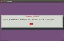 whiptail --title "Example Dialog" --msgbox "This is an example of a message box. You must hit OK to continue." 8 78
