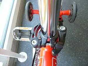 Some bicycles suffer from a slipping seatpost. During the ride, the weight of the rider is too much for the installed seat post clamp. Usually, the seat post clamp can be tightened without damage, but in some bicycles, notably the Brompton folding bicycle, it is harmful to tighten the clamp to the level needed by a heavy rider. (Riders who weigh more than about 80Kg). The solution for the Brompton is to set the existing clamp as usual, but to add an additional quick release seat clamp at the point where the seat post exits the frame. Setting both clamps will overcome the slippage and will not permanently modify the bike. A Sunlite QR Seat Post Clamp, 31.8mm does the job but alas, needs some modification; the inside rim of the clamp needs to be removed by filing before it will slide onto the seatpost. The use of a bench vise is recommended.