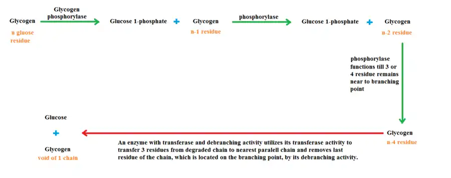 Alpha-1,4 linkage is degraded by the glycogen phosphorylase, shortly phosphorylase. So phosphorylase can rupture interrraction between glucose residues that are in linear order. Phosphorylase breaks glucose residue as glucose 1- phosphate which needed to be further processed. Note that also parallel strand is cut with the target one however in figure to illustrate easier it is not mentioned. Phosphorylase continues until come near to the alpha-1,6. After that point, an enzyme having the opportunity of transferase and debranching activity takes the remaining job. Firstly, be means of its transferase activity, this enzyme transfer remained glucose residues, except the one located on branching point, to the end of the chain which degraded chain is linked. Now, the turn comes to disrupt the branching point, means that alpha-1,6 linkage. This process is carried out again by the enzyme also having debranching ability. By this ability, the enzyme yields glycogen that lost its one branch and glucose.