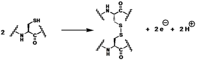 Disulfide bonds form between the sulfur atoms of two cysteine side chains in a protein. The side chains undergo a reversible oxidation of the sulfhydryl groups of the cysteine, which results in covalent bonding of the sulfur atoms (S-S). This bonding is called a "disulfide bridge". Typically, disulfides don't form on the surface of proteins because of the presence of reducing agents in the cytoplasm. These bonds are of great importance concerning the shaping of protein structure; their formation guides the folding of peptide chains as the proteins are produced. Structural proteins that have to be rigorously stable (for example, Keratin, which is found in nail, horn and crustacean shell) often contain a large number of disulfide bonds.