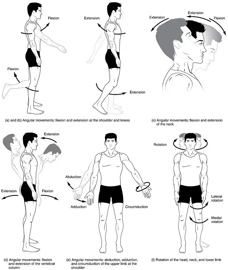 - 'Flexion' means a bending movement that decreases the angle between two parts like bending elbow, siting down and so on.