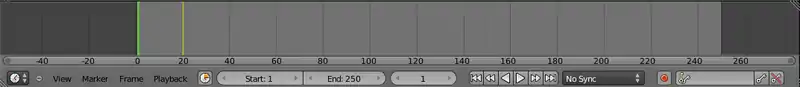 The numbers across the bottom are frame numbers, with your animation starting at frame 1. The light grey background indicates the total duration of the animation. The vertical green line is positioned at the current frame time, and the current frame number is also displayed in the box between the start/end values and the transport controls, and at the lower left of the viewport in the 3D view window. Yellow lines indicate where keyframes have been inserted.
