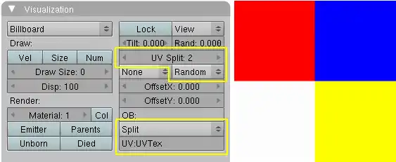 The simplest thing we can do is to give every billboard its own fraction of an image texture. We're going to use a simple image (Img. 2a, right hand side) and split this in four parts (UV Split = 2, horizontally and vertically).