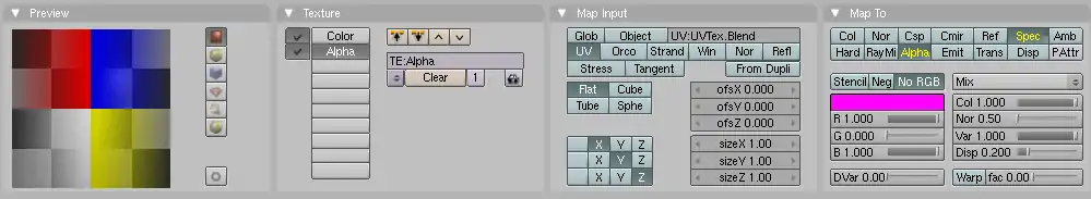 - Set Map Input to UV. If you only have one active UV layer this is used by default, but if you want to continue this tutorial you have to fill in the name of the UV set also (i.e. "UVTex").
