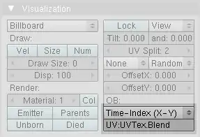 - Select the UV channel Time-Index (X-Y) in the Visualization panel of the particle system. Fill in the name of the newly created UV layer "UVTex.Blend". This creates an additional set of UV coordinates in this UV layer.