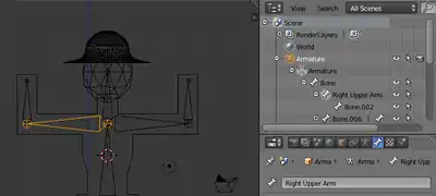 Now, just to make things easier, we're going to name the bones. For example, my bones are named "Right Forearm", "Left Forearm", "Right Upper Arm", etc. While in Edit mode, select the bone you want to rename. In the Outliner , the bone you have selected will be visible with a circle around it