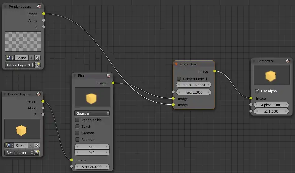 Now, add a Blur node (Filter submenu of the Add menu). The default Gaussian kind of blur will do fine. Put nonzero values (e.g. 1) into the X and Y fields (otherwise the blur Size value will have no effect). Give it a Size value of, say, 20. Connect the Image output of the first render layer (the one doing everything except the edge outlines) into its Image input.