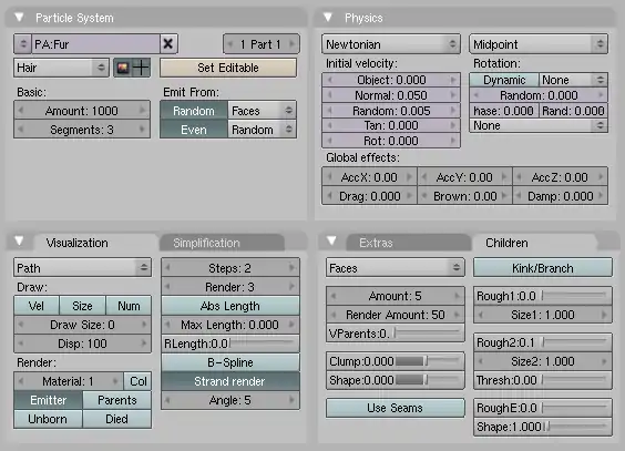 For fur you need lot's of particles, like 1.000.000 upwards. This will hurt us badly if we have to deal with so many particles in the 3D window and want to render it. Therefore, we will create the great amount of particles with so called "children", that mimic the behavior of their parents. The amount of particle parents should be as low as possible, but you need a certain amount to control the distribution of the hair. We will also use as little control points as possible, three segments should be enough for short fur.